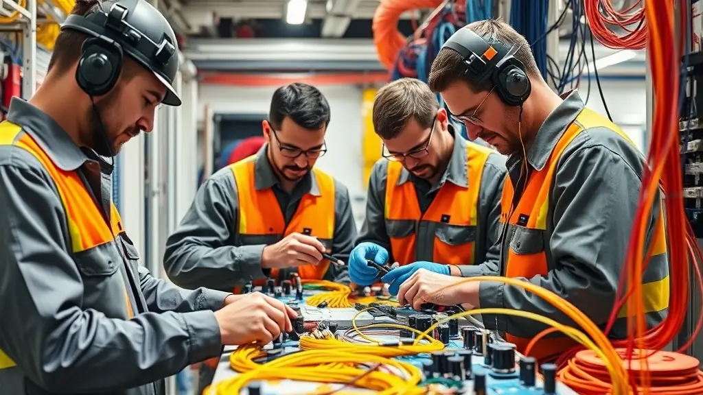 A technician working on a fiber optic cable splice in a clean, modern data center environment, showcasing precision and expertise.